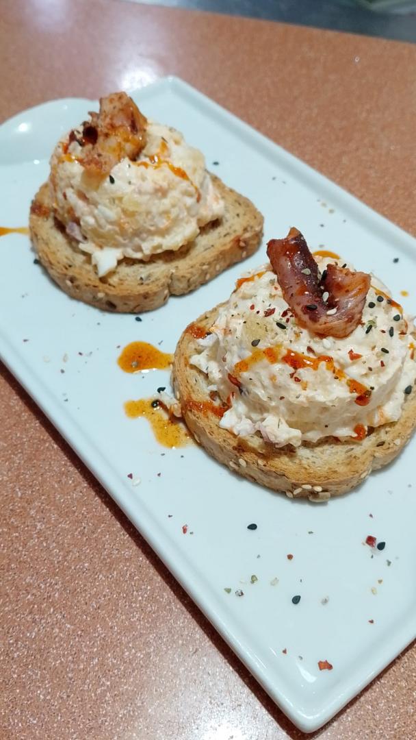 Con carrillera desmenuzada, guacamole, cebolla morada, huevo de codorniz y cebolla crujiente